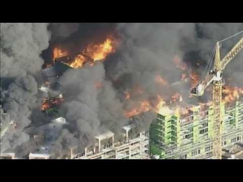 (CNN) -- Half of the firefighters on duty in San Francisco on Tuesday night were battling a blaze at a construction site that is threatening nearby buildings, authorities said.